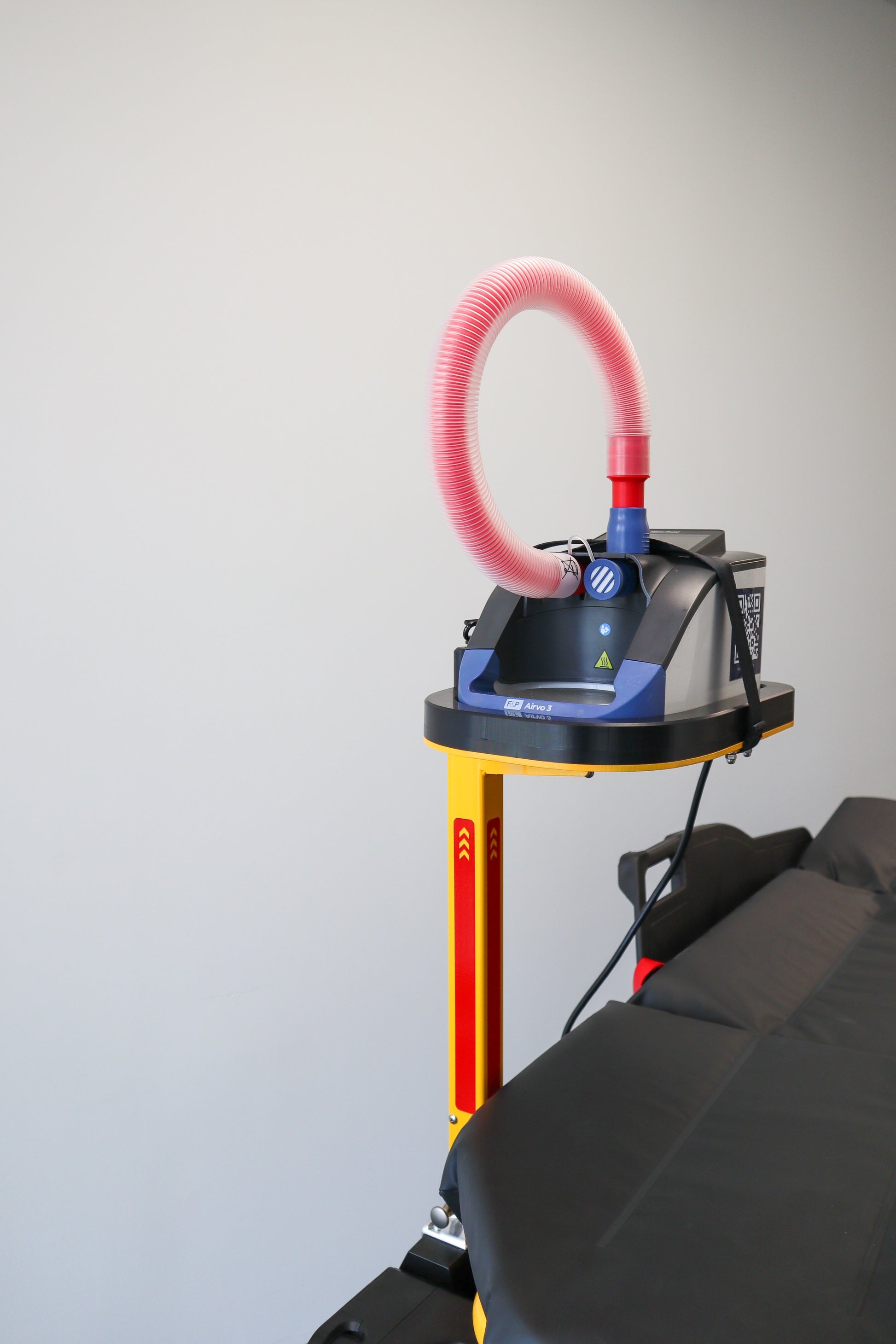 Intended Use: This custom cot pole is intended for medical professionals who utilize the Airvo 3 in patient care settings and require an efficient way to integrate IV therapy without compromising space or accessibility. It is designed to support the secure attachment of the Airvo 3 and an IV pole, facilitating streamlined care delivery in hospitals, emergency rooms, and during patient transport.